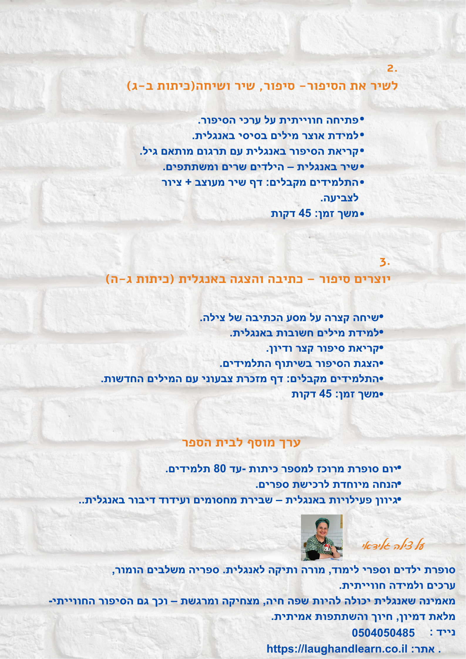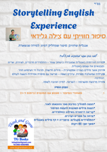 Give your students a Storytelling English Experience! Invite me to you school to tell one of my stories to your class in an exciting and enjoyable way! For grades 3-6. Call me today at 0504050485.
